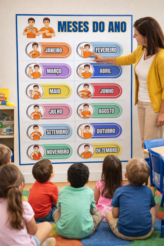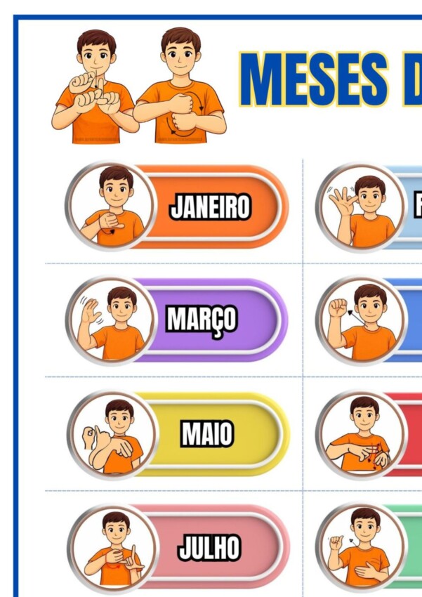 O Painel Meses do Ano em Libras é um material educativo bilíngue, visual e colorido, desenvolvido especialmente para a educação de alunos surdos. O recurso apresenta os 12 meses do ano com sinalização em Libras e legenda em português, facilitando a associação entre a língua de sinais e a leitura escrita.