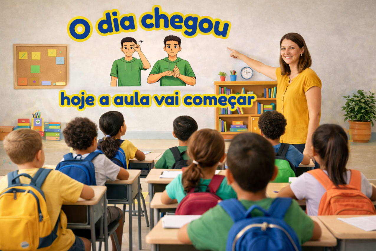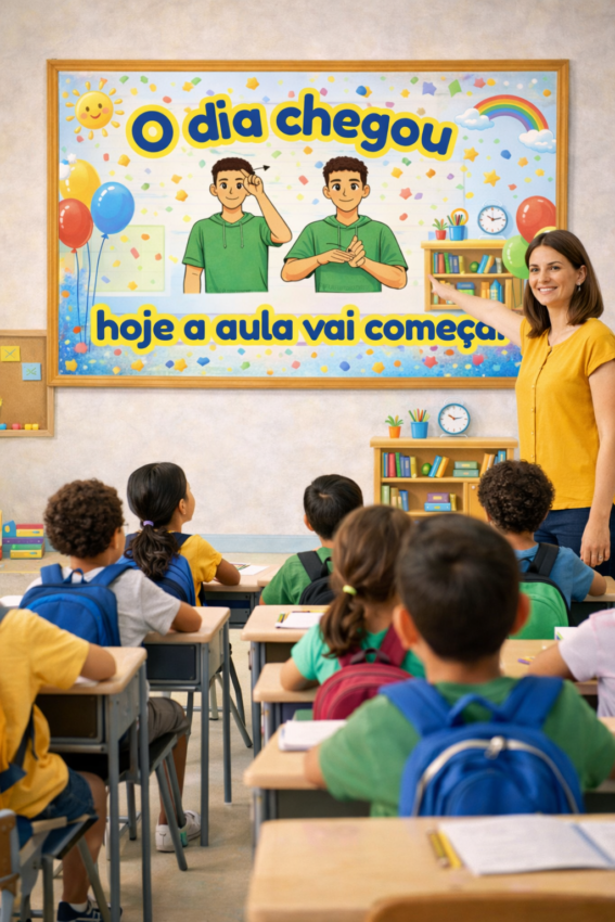 O Mural Bilíngue em Libras – “O dia chegou, hoje a aula vai começar” foi desenvolvido especialmente para acolher as crianças no primeiro dia de aula, promovendo um ambiente afetivo, visual, acessível e inclusivo.