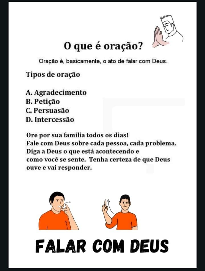 O conteúdo apresenta, de forma simples, visual e acessível, os principais conceitos sobre oração, ensinando que orar é falar com Deus e mostrando diferentes formas de se comunicar com Ele no dia a dia.